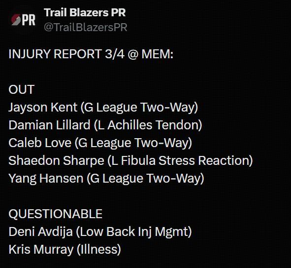 北京时间3月5日NBA常规赛,开拓者将对阵灰熊。赛前开拓者公布了本场比赛的伤病名单。